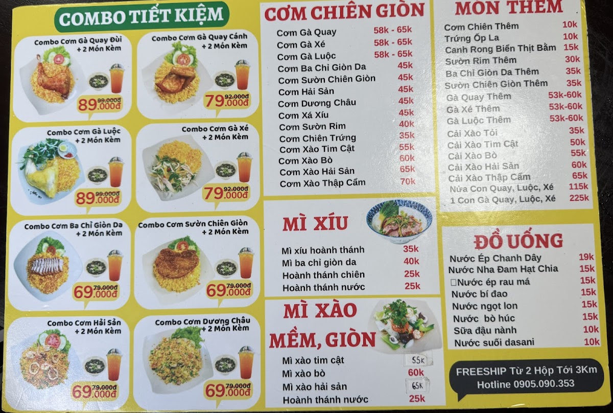 The menu features enticing options, including Combo Tiết Kiệm and Combo Ưu Đãi, catering to both budget-conscious diners and those looking to indulge. Customers rave about the fluffy fried rice and perfectly cooked chicken thighs, often highlighting the swift service by attentive staff. A complimentary iced tea is offered, enhancing the dining experience without extra cost.
